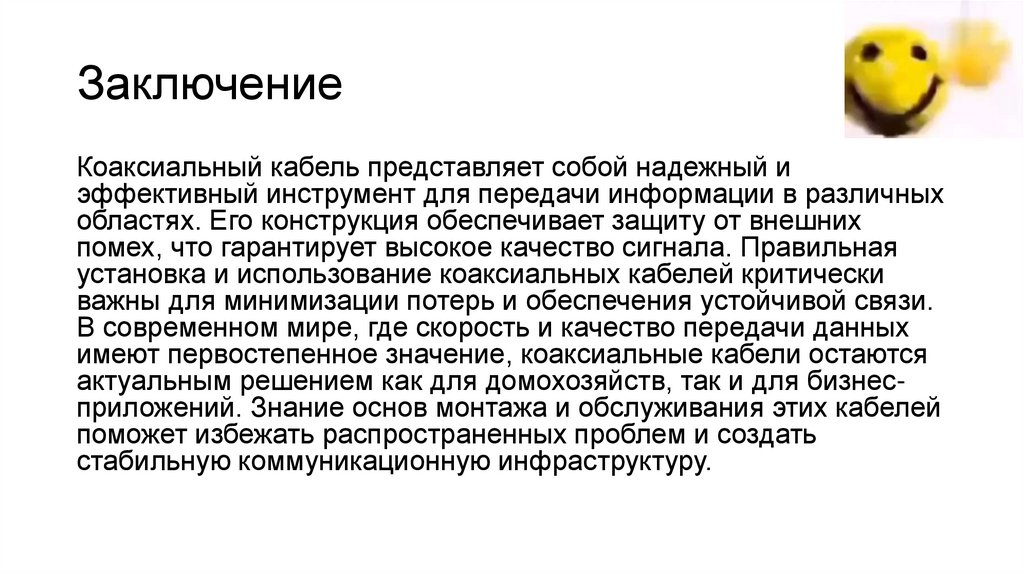 ЗаключениеКоаксиальный кабель представляет собой надежный и