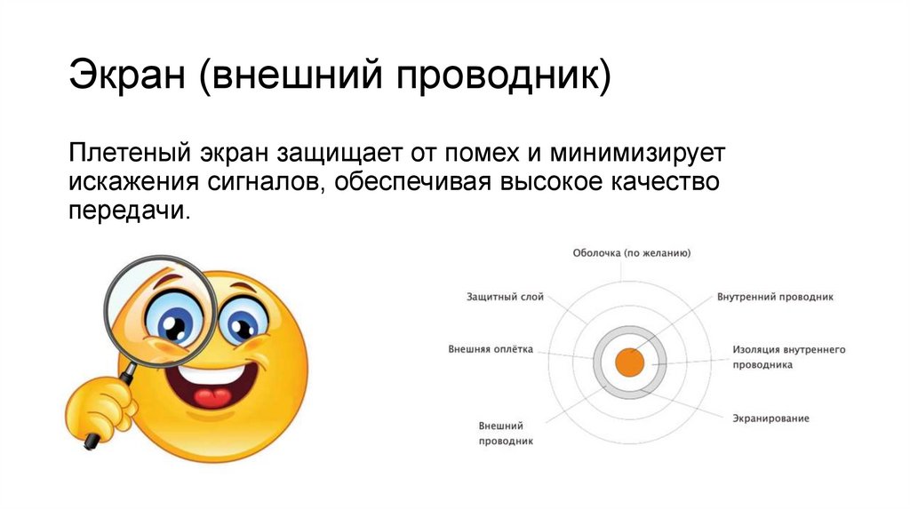 Экран (внешний проводник)Плетеный экран защищает от помех и минимизирует