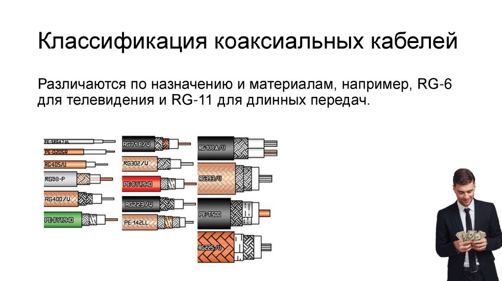 Классификация коаксиальных кабелейРазличаются по назначению и материалам, например, RG-6
