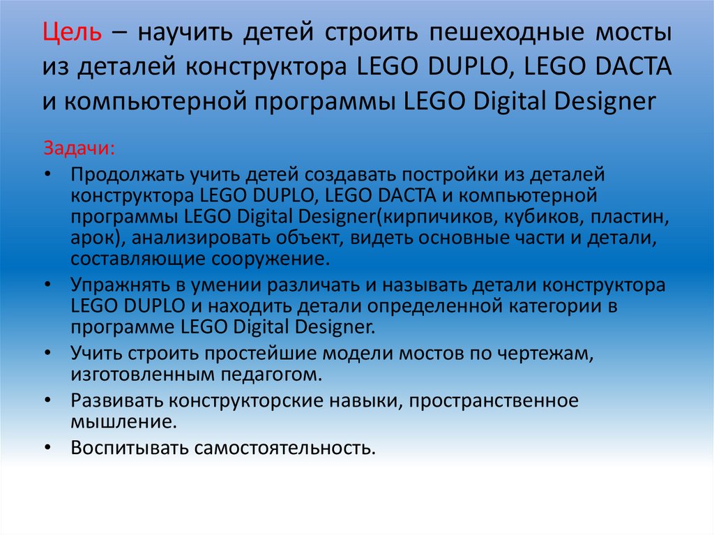 Цель – научить детей строить пешеходные мостыиз деталей конструктора LEGO DUPLO, LEGO DACTA
