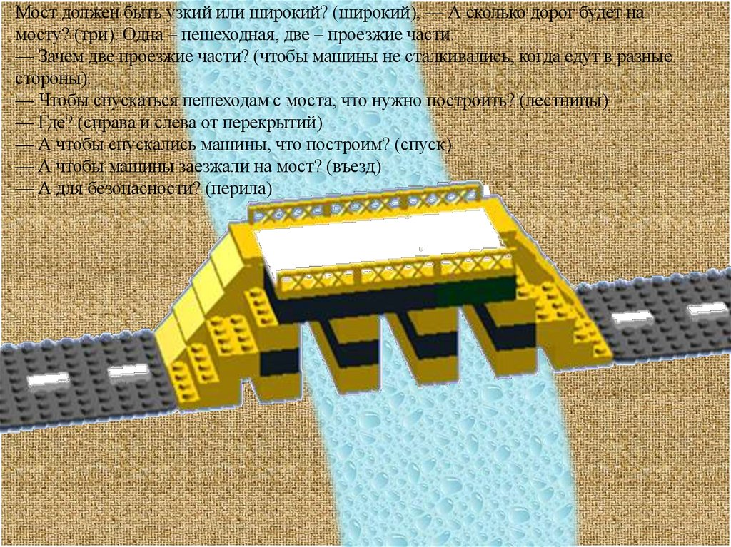 Мост должен быть узкий или широкий? (широкий), — А сколько дорог будет намосту? (три). Одна – пешеходная, две – проезжие части.