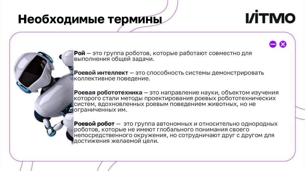 Необходимые терминыРой — это группа роботов, которые работают совместно для
