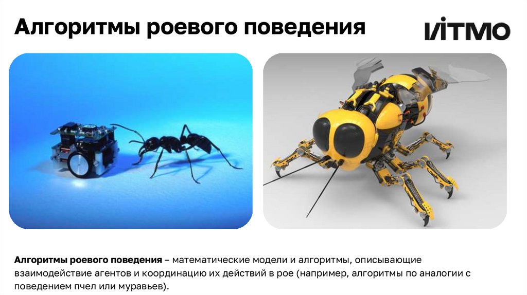 взаимодействие агентов и координацию их действий в рое (например, алгоритмы по аналогии с