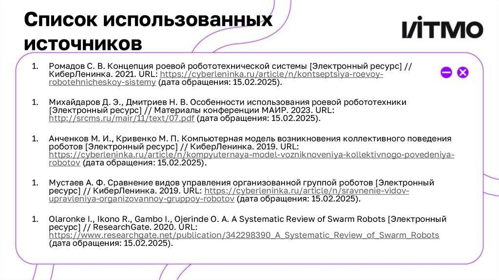 КиберЛенинка. 2021. URL: https://cyberleninka.ru/article/n/kontseptsiya-roevoyrobotehnicheskoy-sistemy (дата обращения: 15.02.2025).