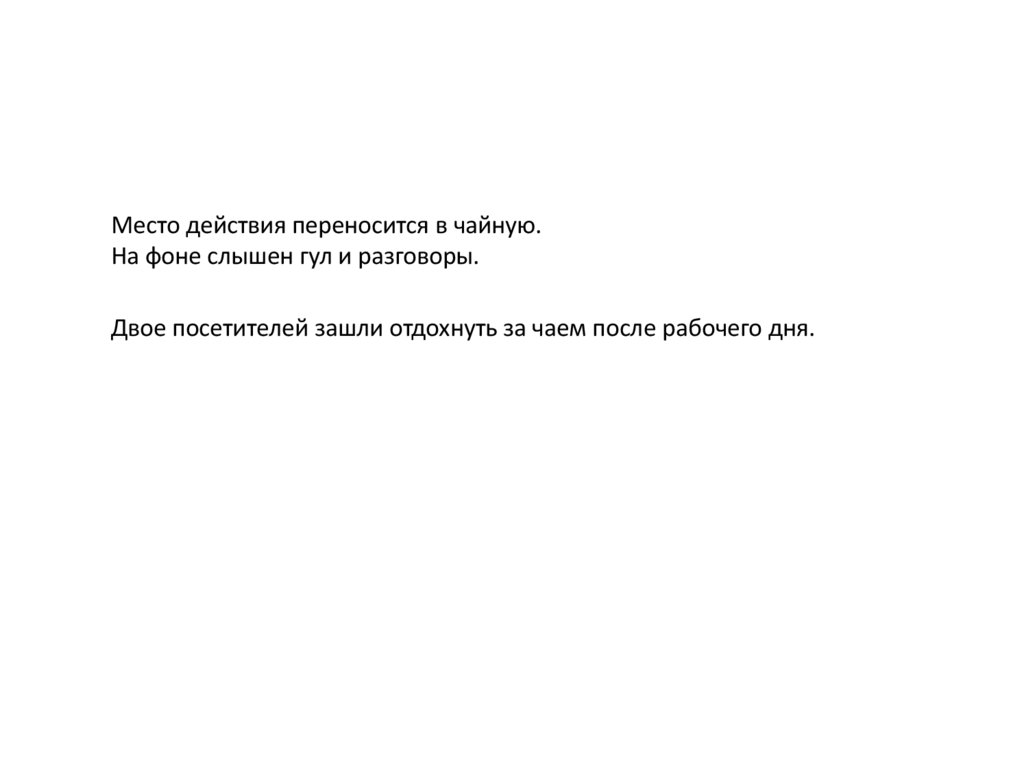 Место действия переносится в чайную.На фоне слышен гул и разговоры.