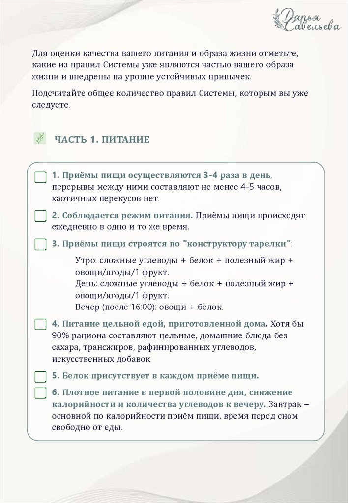 Для оценки качества вашего питания и образа жизни отметьте,какие из правил Системы уже являются частью вашего образа