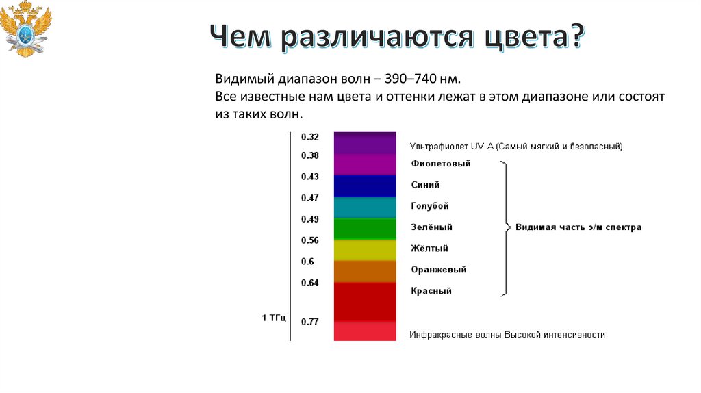 Видимый диапазон волн – 390–740 нм.Все известные нам цвета и оттенки лежат в этом диапазоне или состоят