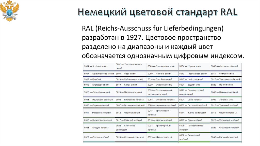 RAL (Reichs-Ausschuss fur Lieferbedingungen)разработан в 1927. Цветовое пространство