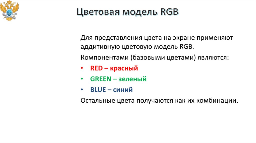 Для представления цвета на экране применяютаддитивную цветовую модель RGB.