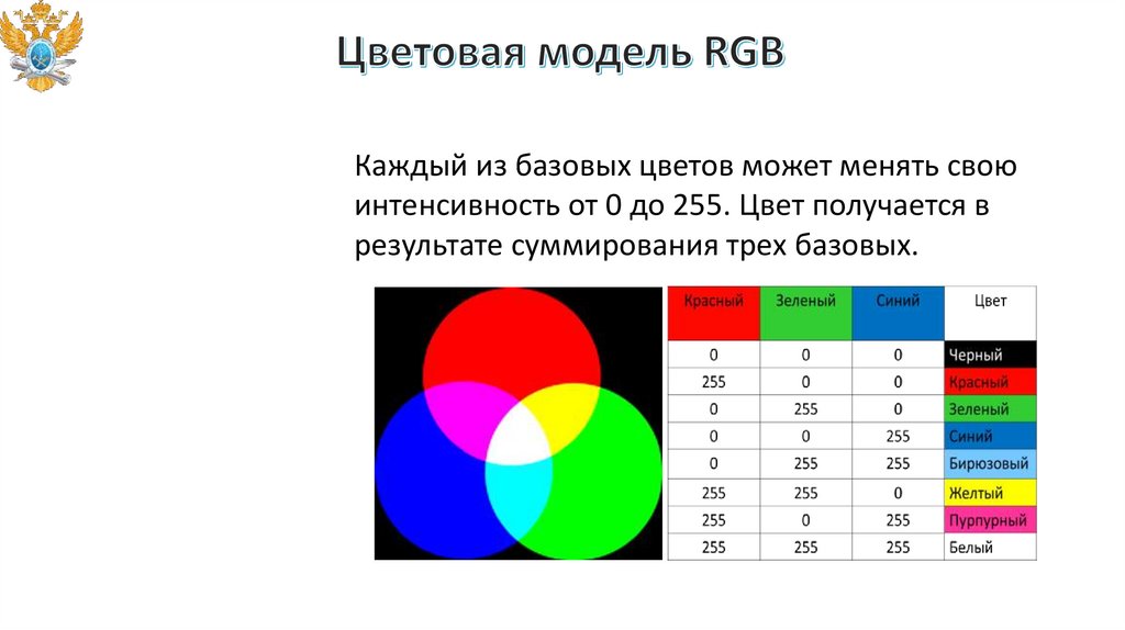 Каждый из базовых цветов может менять своюинтенсивность от 0 до 255. Цвет получается в
