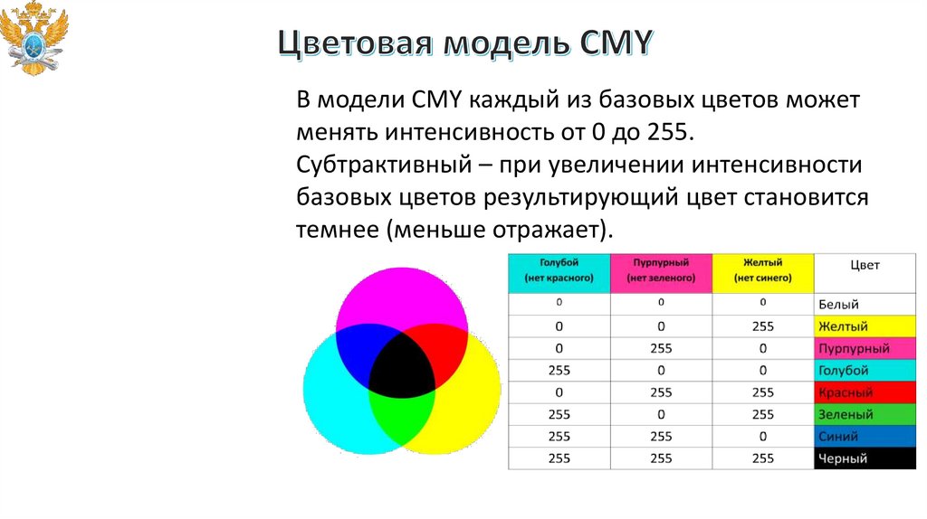 В модели CMY каждый из базовых цветов можетменять интенсивность от 0 до 255.