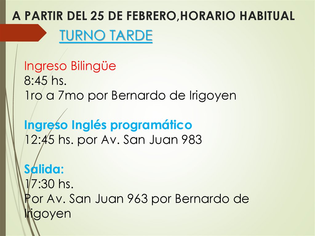 A PARTIR DEL 25 DE FEBRERO,HORARIO HABITUALTURNO TARDE