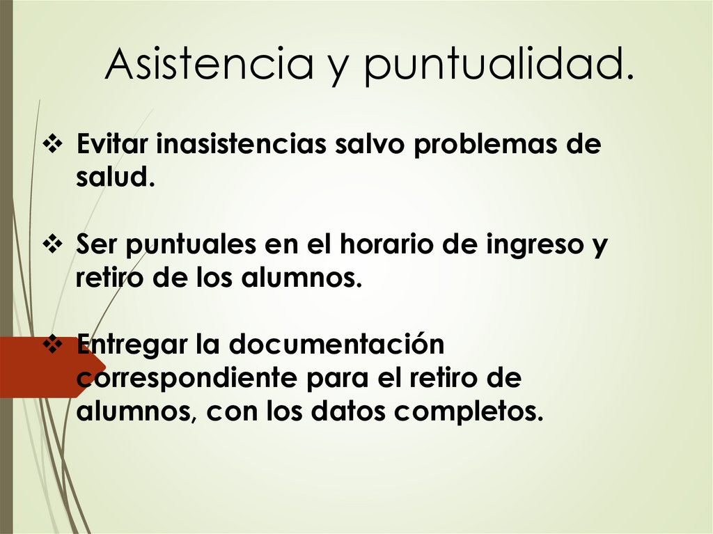 Asistencia y puntualidad.Evitar inasistencias salvo problemas de