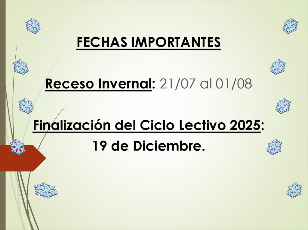 FECHAS IMPORTANTESReceso Invernal: 21/07 al 01/08