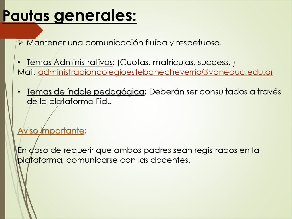 Pautas generales:Mantener una comunicación fluída y respetuosa.