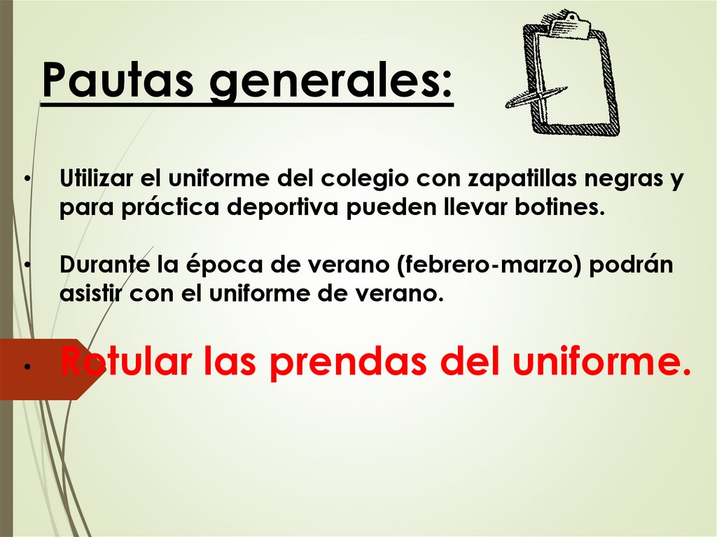 Pautas generales:Utilizar el uniforme del colegio con zapatillas negras y