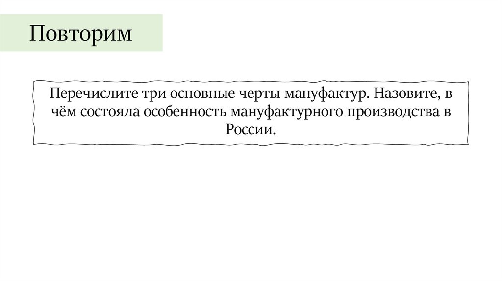 ПовторимПеречислите три основные черты мануфактур. Назовите, в