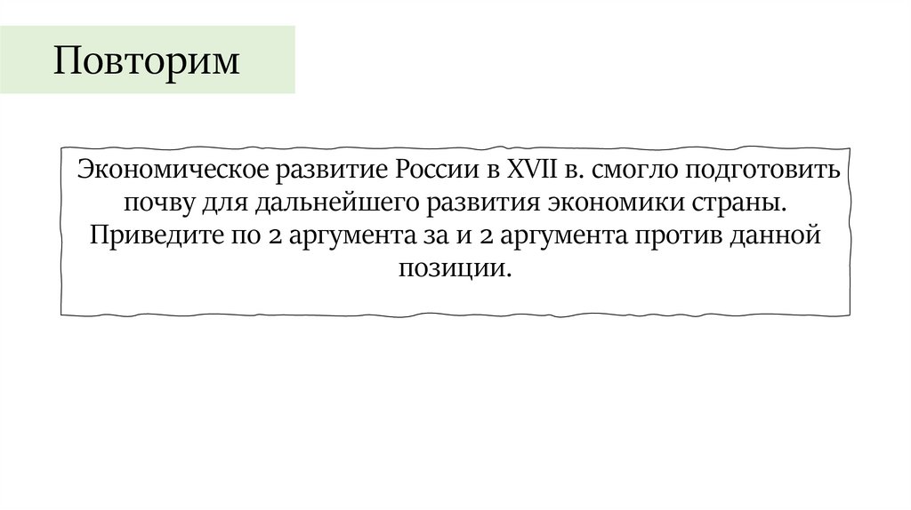 ПовторимЭкономическое развитие России в XVII в. смогло подготовить