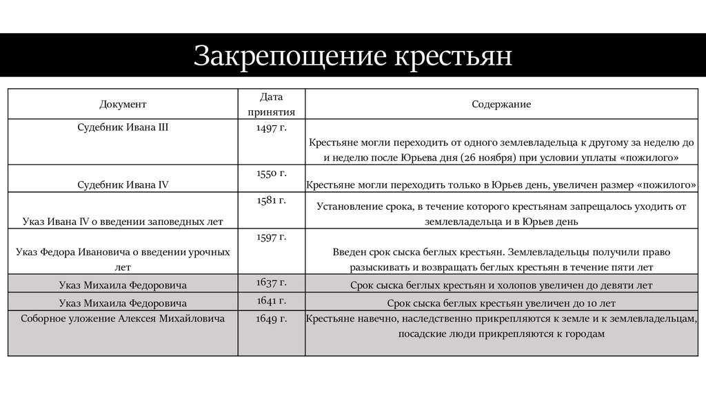 Крестьяне могли переходить только в Юрьев день, увеличен размер «пожилого»