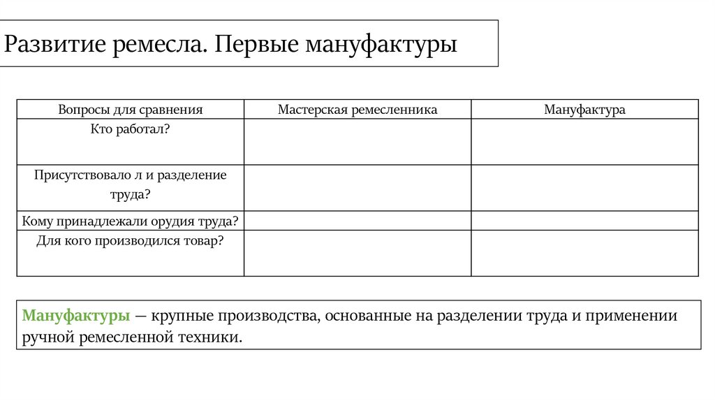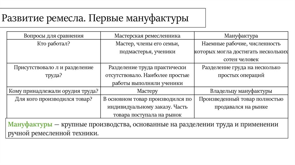 Развитие ремесла. Первые мануфактурыВопросы для сравнения