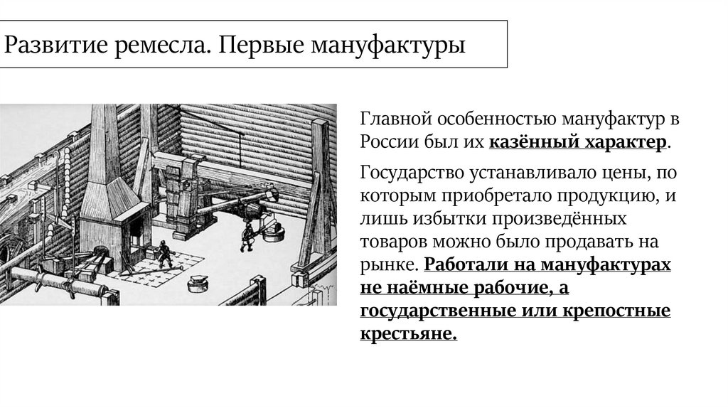 Развитие ремесла. Первые мануфактурыГлавной особенностью мануфактур в