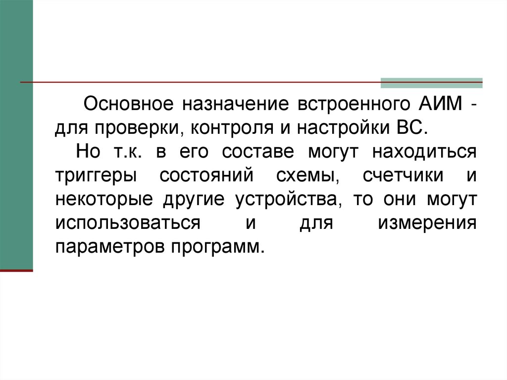 Основное назначение встроенного АИМ для проверки, контроля и настройки ВС.Но т.к. в его составе могут находиться