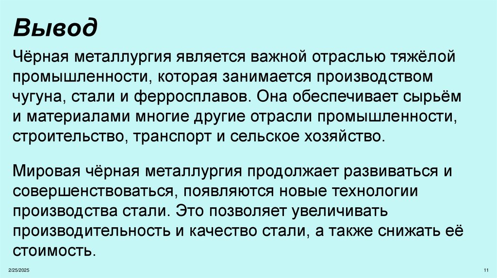 ВыводЧёрная металлургия является важной отраслью тяжёлой