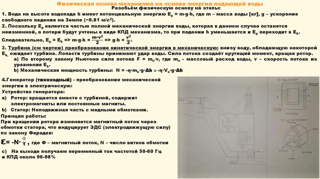 Физическая основа механизма на основе энергии падающей водыРазобьём физическую основу на этапы: