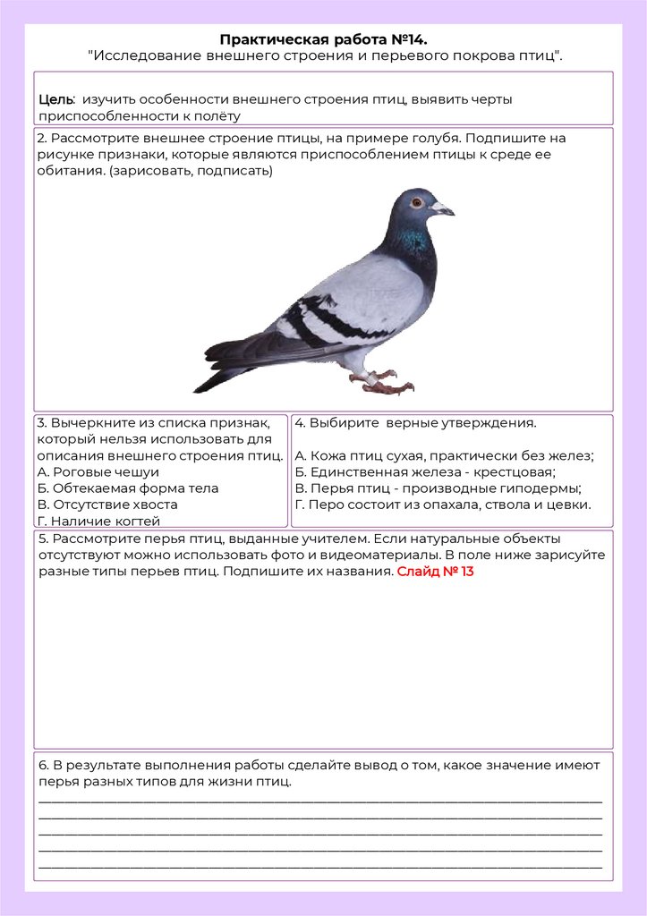 Практическая работа №14."Исследование внешнего строения и перьевого покрова птиц".