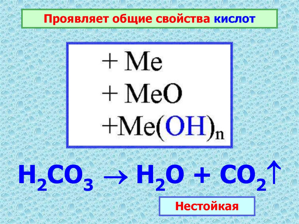 Проявляет общие свойства кислотH2CO3 H2O + CO2