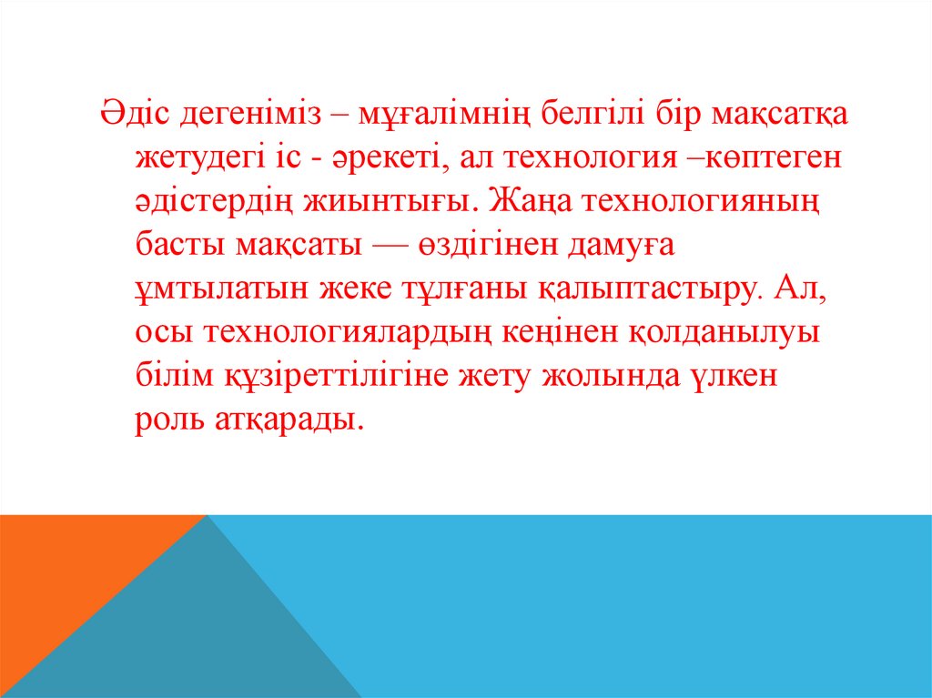 Әдіс дегеніміз – мұғалімнің белгілі бір мақсатқажетудегі іс - әрекеті, ал технология –көптеген