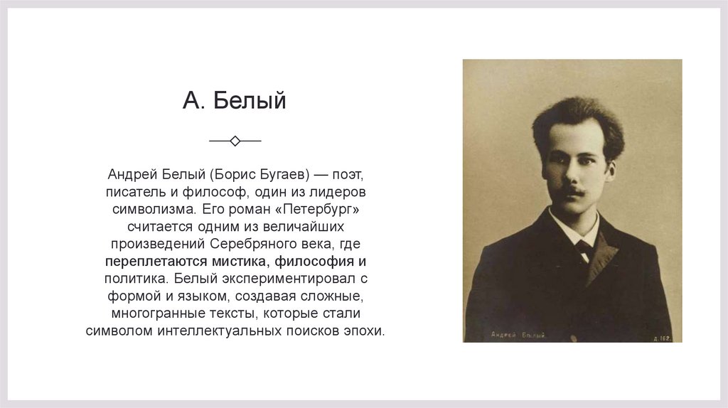 А. БелыйАндрей Белый (Борис Бугаев) — поэт,