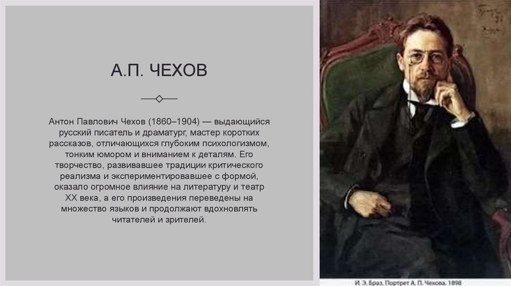 А.П. ЧЕХОВАнтон Павлович Чехов (1860–1904) — выдающийся