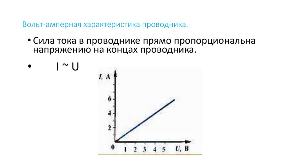 Вольт-амперная характеристика проводника.• Сила тока в проводнике прямо пропорциональна