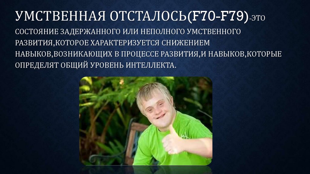 УМСТВЕННАЯ ОТСТАЛОСЬ(F70-F79)-ЭТОСОСТОЯНИЕ ЗАДЕРЖАННОГО ИЛИ НЕПОЛНОГО УМСТВЕННОГО
