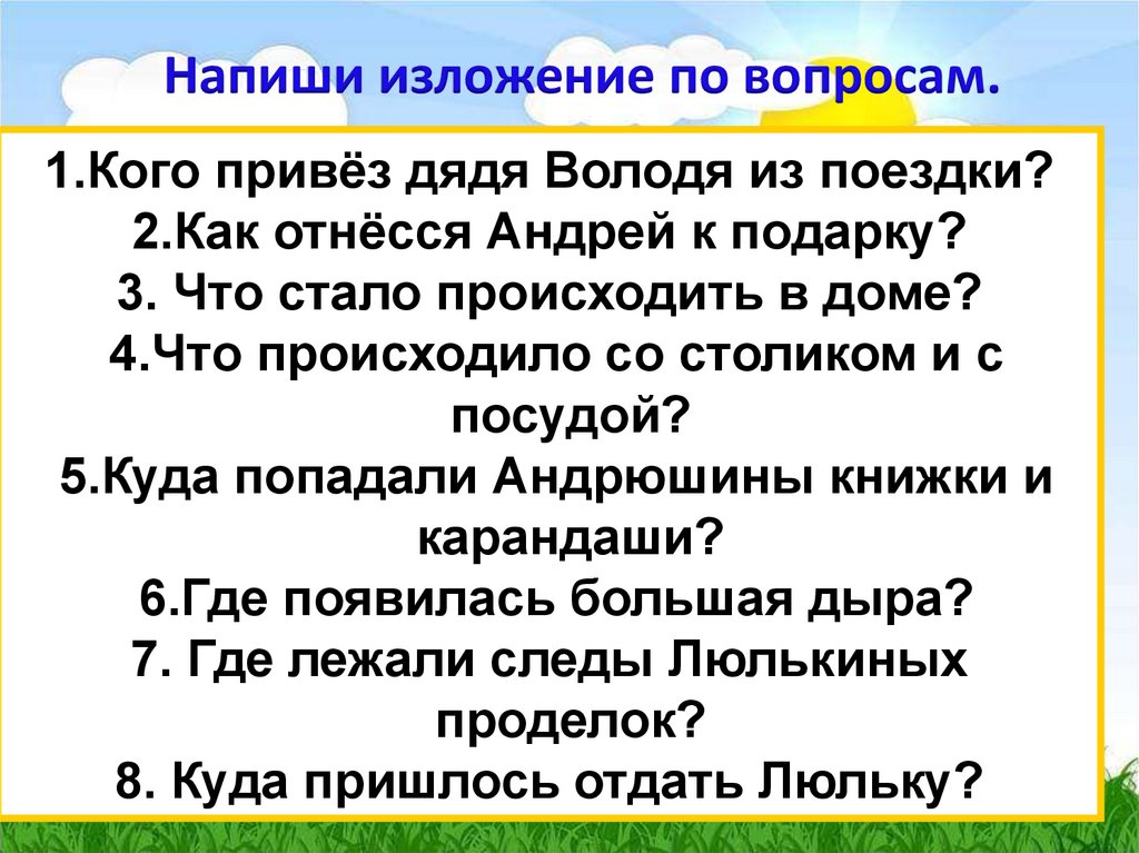 Напиши изложение по вопросам.1.Кого привёз дядя Володя из поездки?