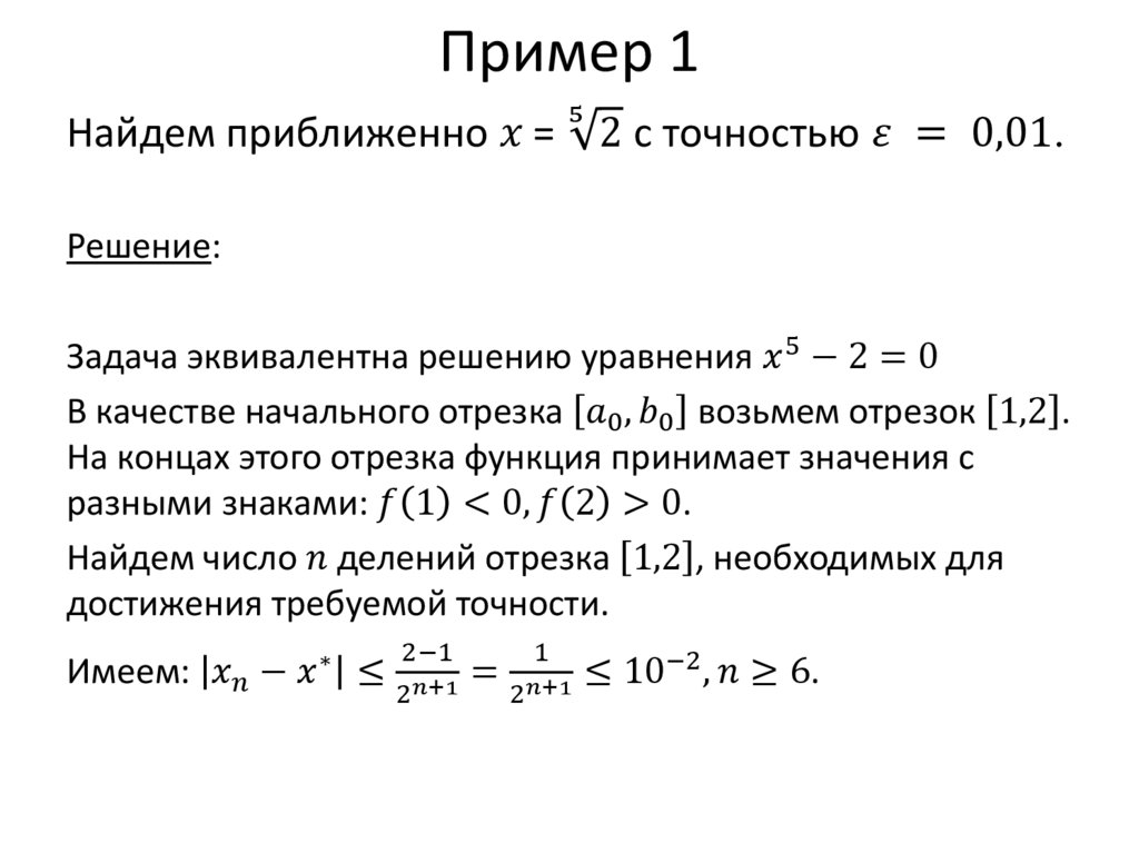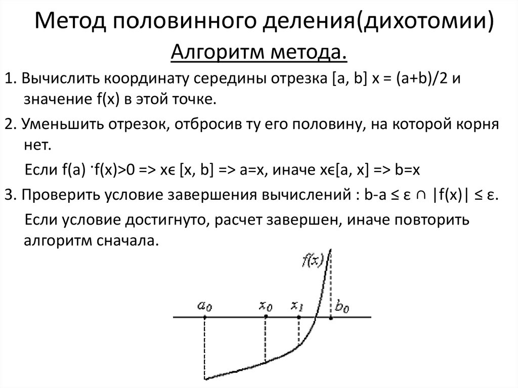 Алгоритм метода.1. Вычислить координату середины отрезка [a, b] x = (a+b)/2 и