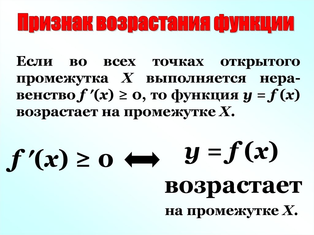 Если во всех точках открытогопромежутка X выполняется неравенство f ′(x) ≥ 0, то функция y = f (x)