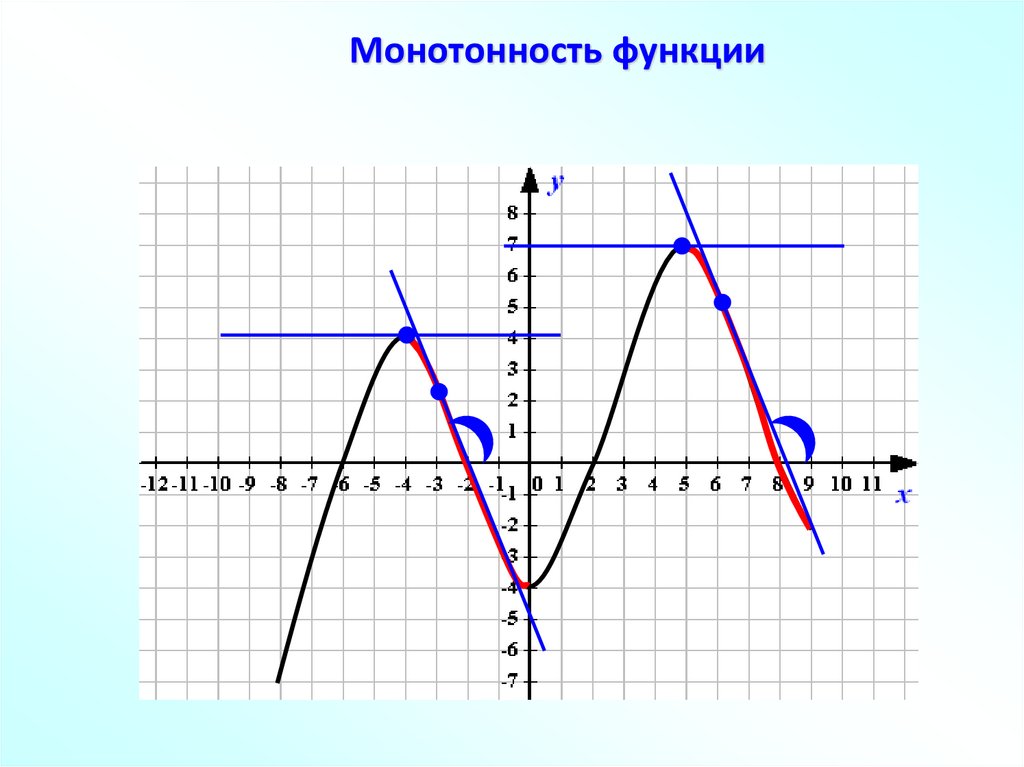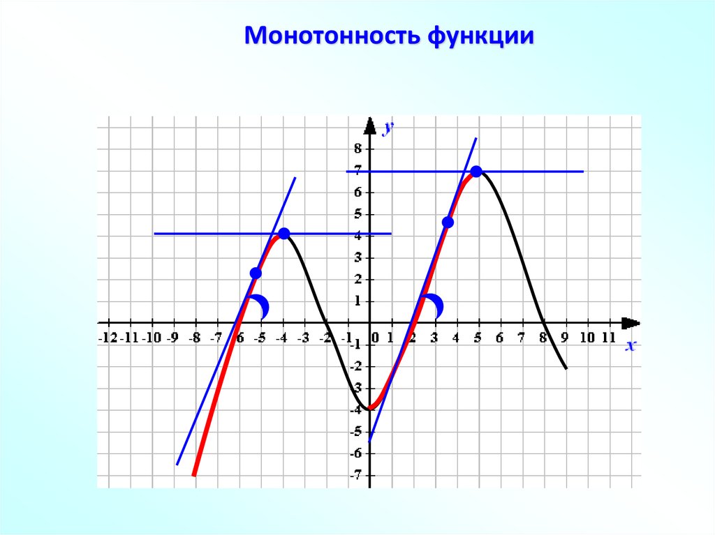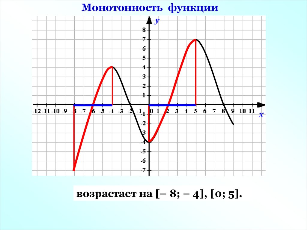 Монотонность функциивозрастает на [– 8; – 4], [0; 5].