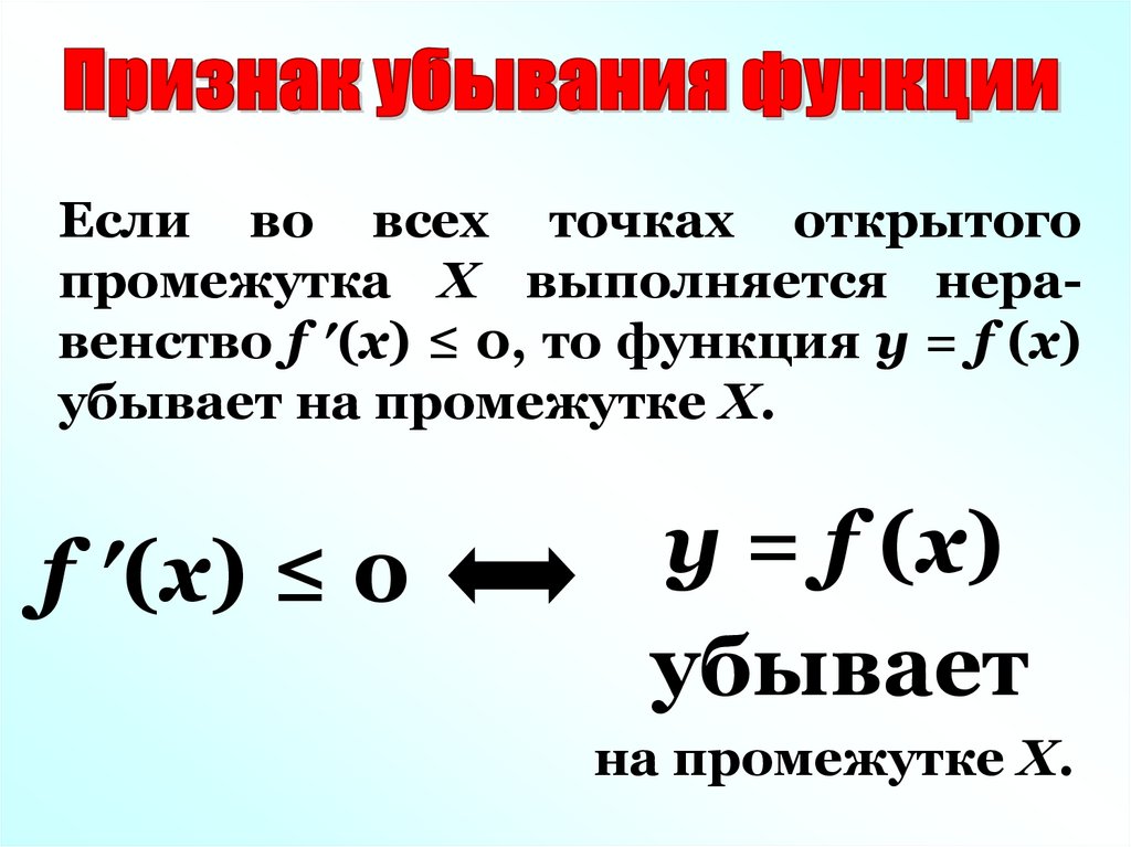 Если во всех точках открытогопромежутка X выполняется неравенство f ′(x) ≤ 0, то функция y = f (x)