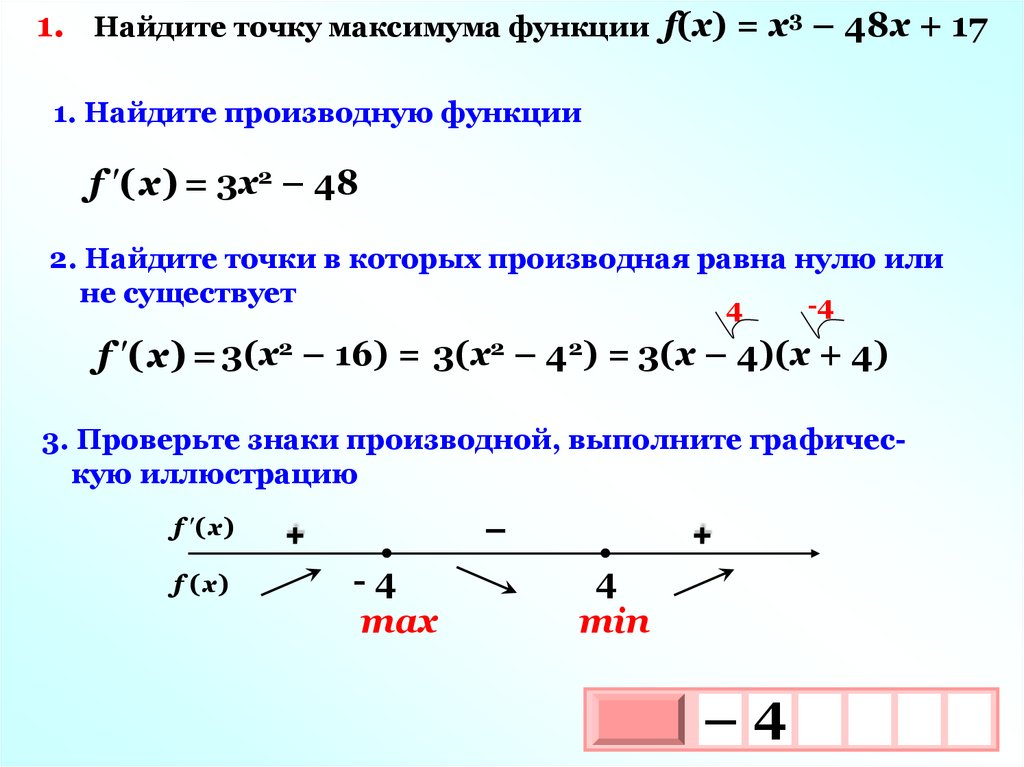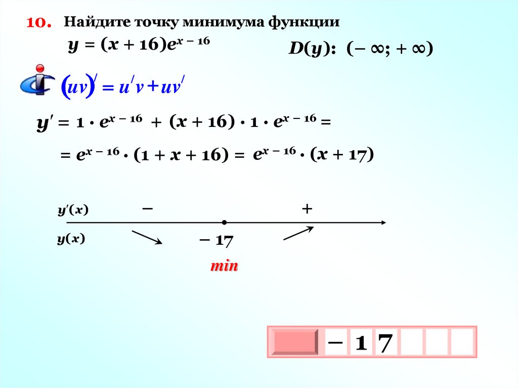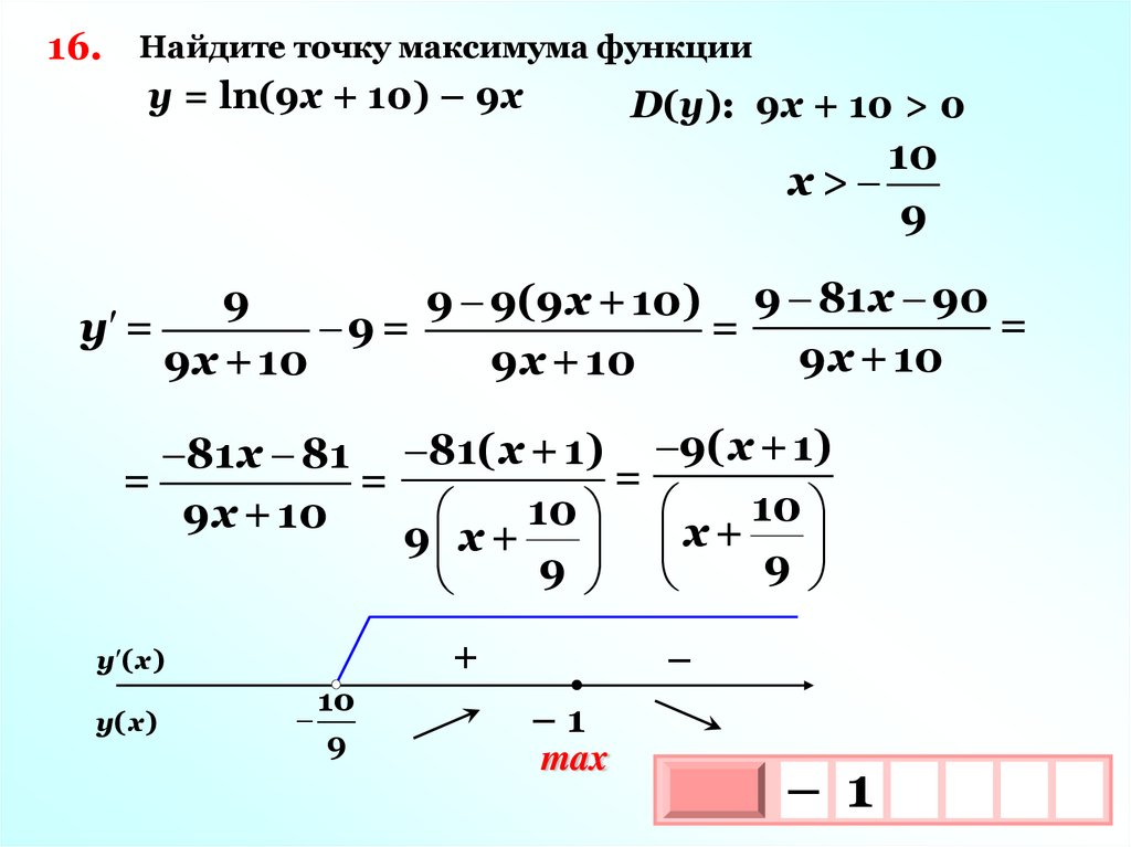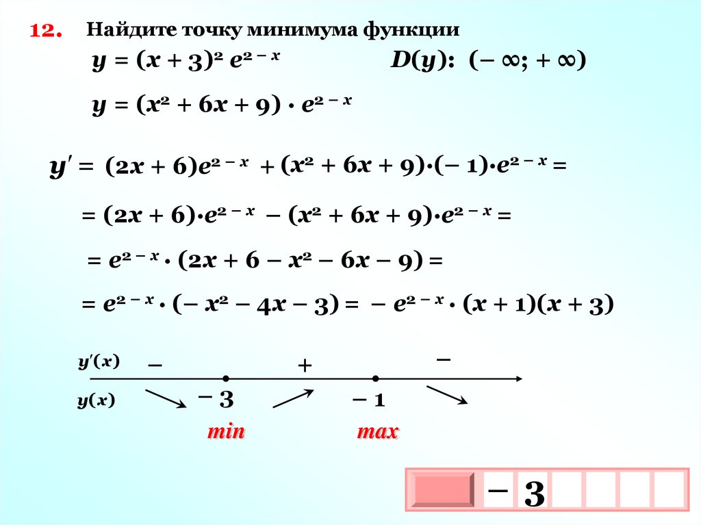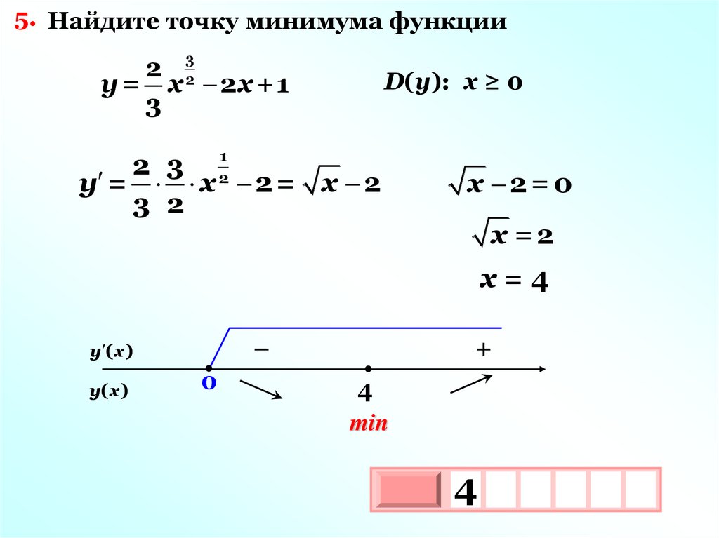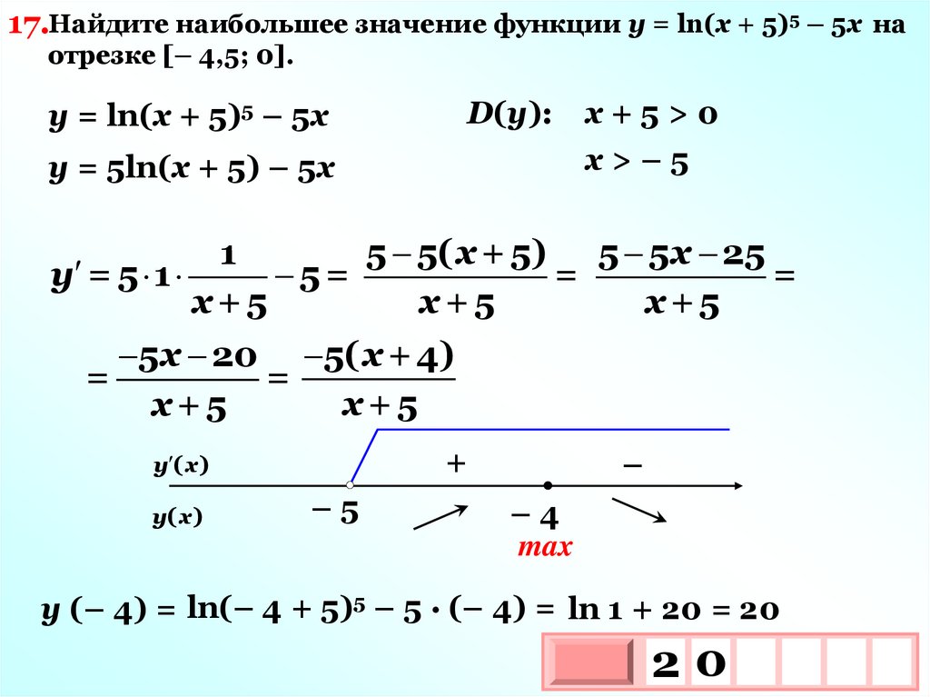 yнаиб = у(– 1) = log5(4 + 2 – 1) + 3 = log55 + 3 = 4