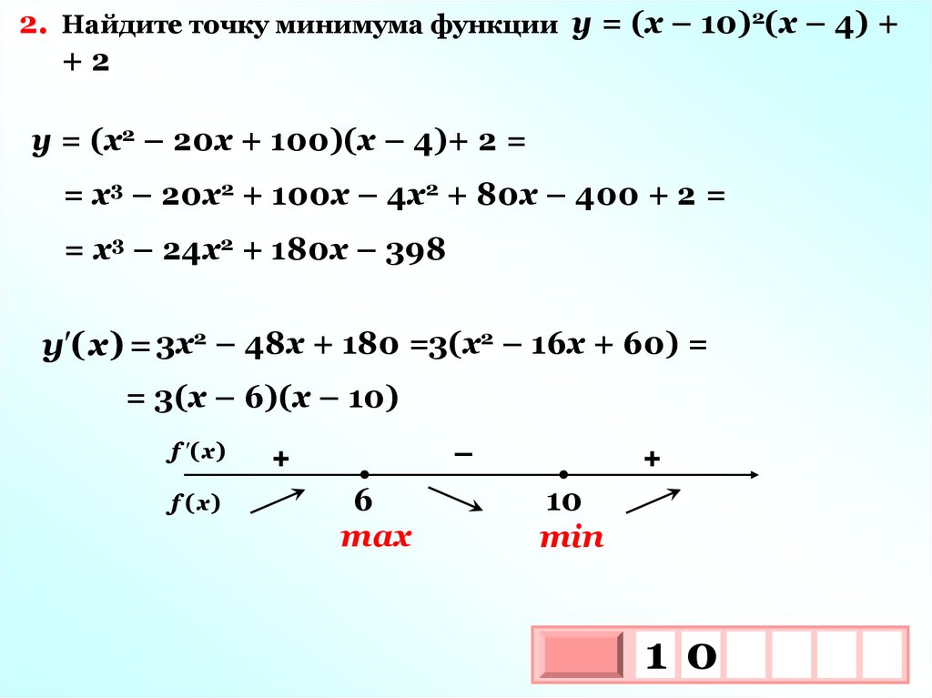 yнаим = у(3) = log3(9 – 18 + 10) + 2 = log31 + 2 = 2