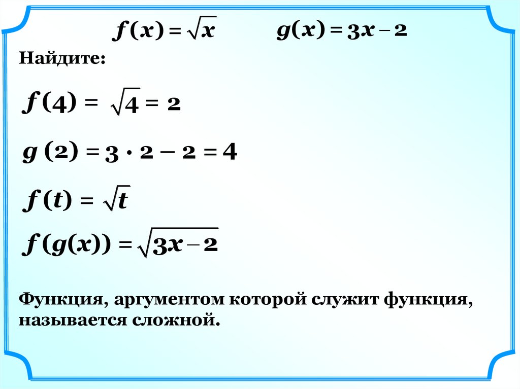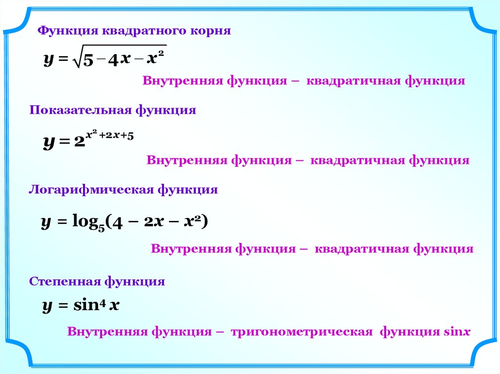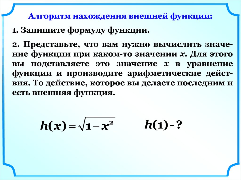 Алгоритм нахождения внешней функции:1. Запишите формулу функции.