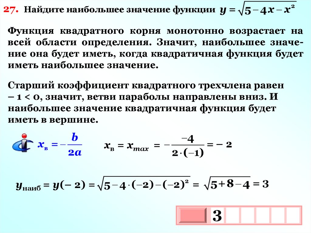 27. Найдите наибольшее значение функции у = 5 4 х х 2Функция квадратного корня монотонно возрастает на