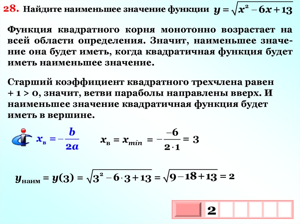 28. Найдите наименьшее значение функции у = х 2 6 х +13Функция квадратного корня монотонно возрастает на