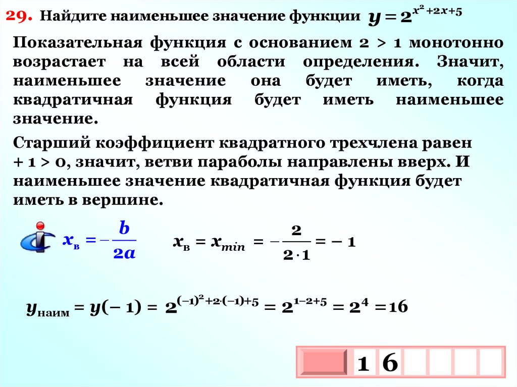 всей области определения. Значит, наименьшее значение она будет иметь, когда квадратичная функция будет