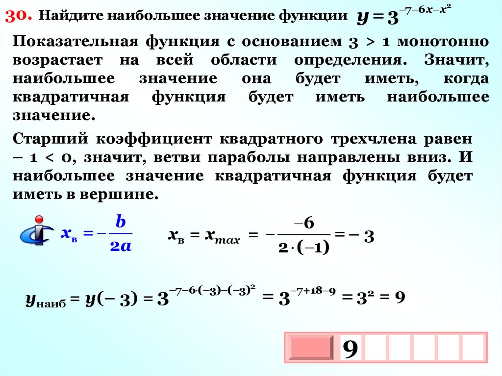 всей области определения. Значит, наибольшее значение она будет иметь, когда квадратичная функция будет
