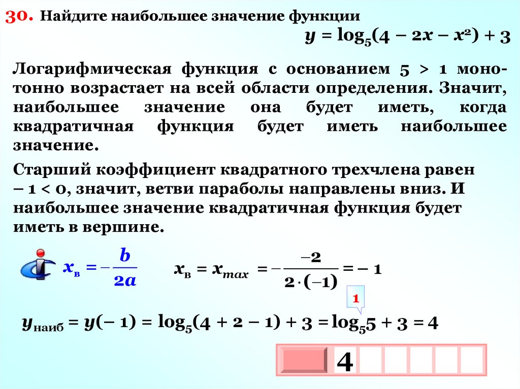 30. Найдите наибольшее значение функцииу = log5(4 – 2х – х2) + 3