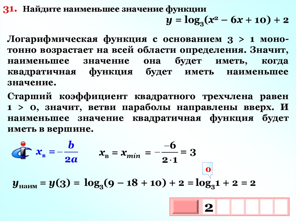 31. Найдите наименьшее значение функцииу = log3(х2 – 6х + 10) + 2