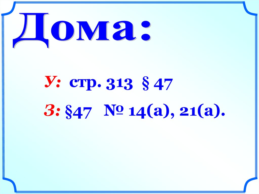 У: стр. 313 § 47З: §47 № 14(а), 21(а).